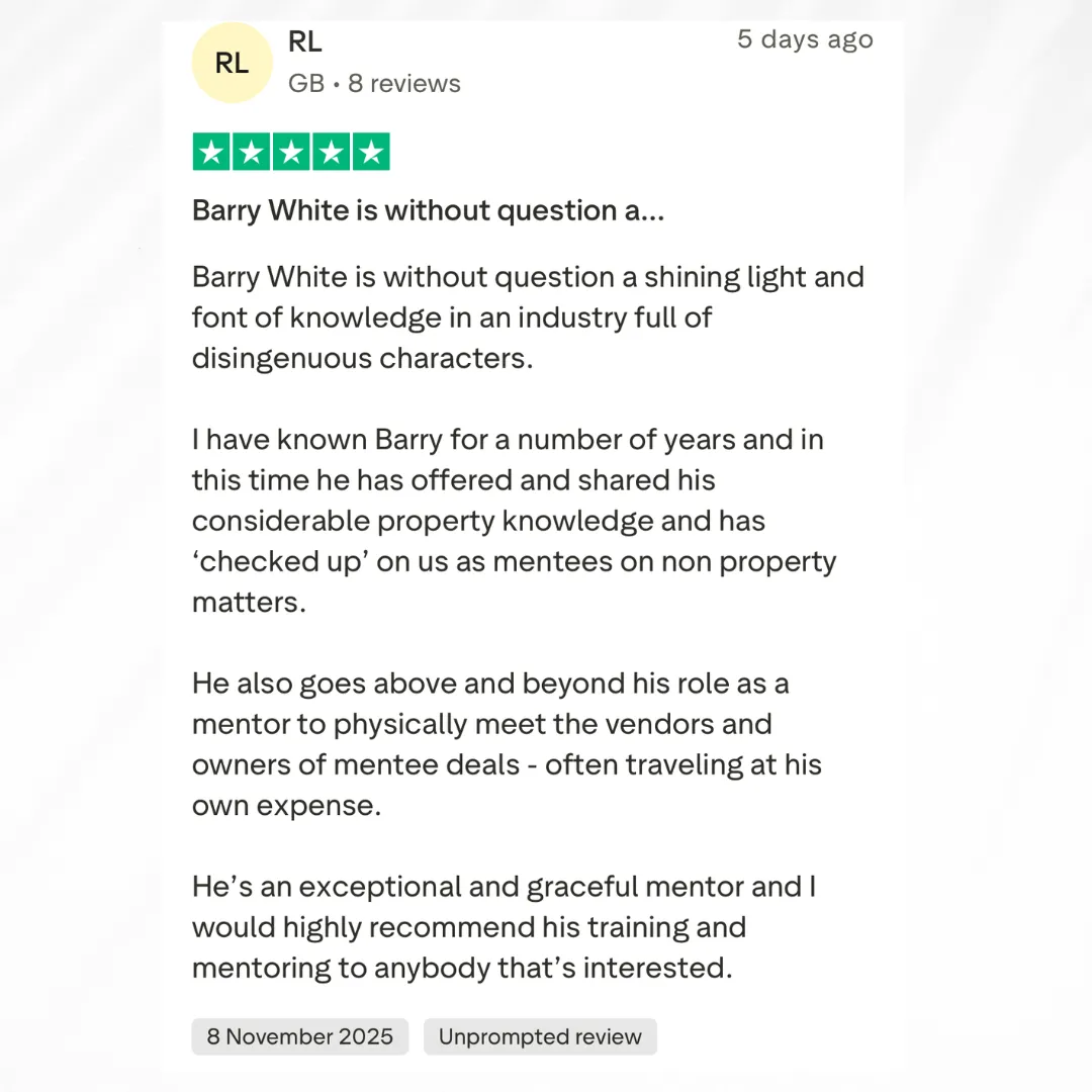 "I attended the property training today with Barry & Shimon, it was a brilliant course, with lots of clear information on how to do things. We got to ask lots and lots of questions all of which were answered. It was absolutely brilliant, highly recommended training"